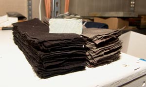 Now realizing the the heat was messing us up too much, we moved our operation into the air conditioned part of the shop. What a difference that made! We had plenty of time to work with the material before it began to heat up and harden. 20 degrees makes a huge difference with this stuff. I made another maroon and tan 70 layer twist piece and Mike Carter made a 70 layer black and gray twist. Here are the layers of black and gray fabric cut and ready to go. We should make a handle block about 1 x 2 inches like the one on top.