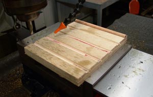 We also decided to try and make a ladder Damascus type pattern. We grooved a couple piece of plywood and glued in some small dowel rods with alternate spacing on the top and bottom pieces.