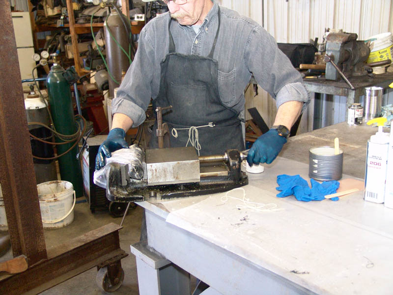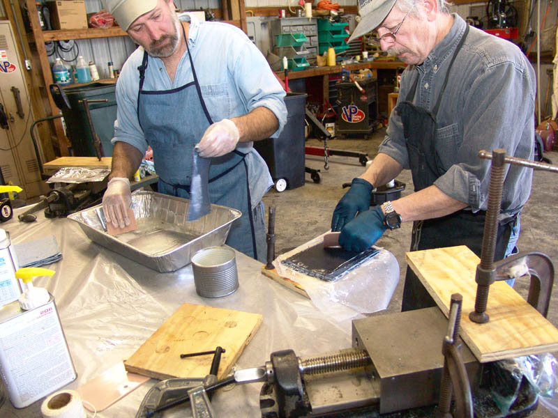 We have developed a pretty efficient system. Mike mixes the epoxy and pours it into an aluminum baking pan where Cliff soaks the strips of fabric.