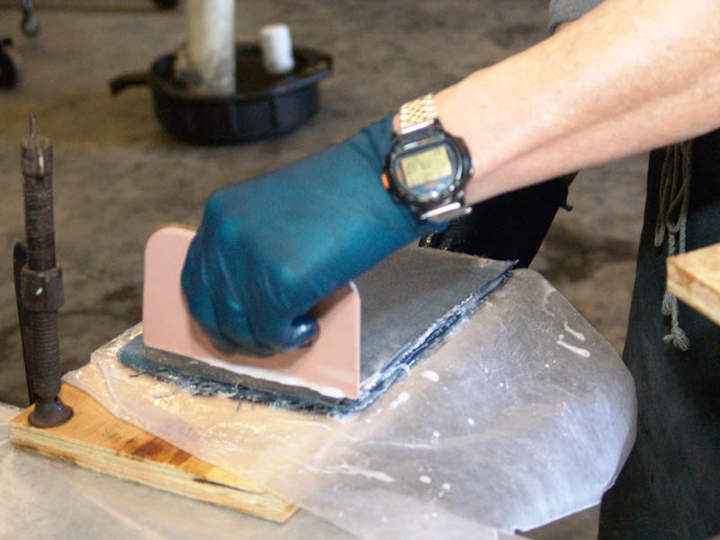 Cliff then hands the saturated layer of fabric to Mike who stacks it and squeegees out any excess epoxy and air pockets.