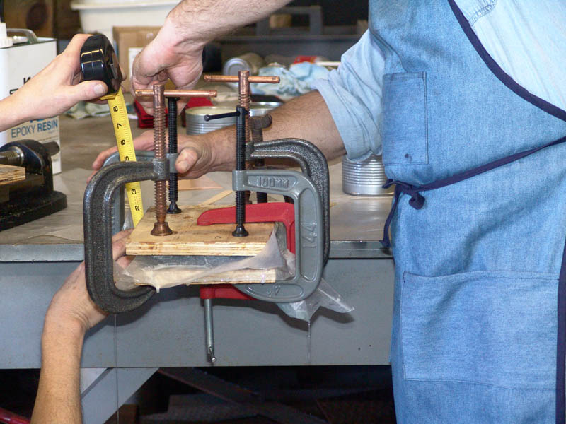 Now we clamp the top piece of plywood with C-clamps. We measure all sides to make sure we have uniform thickness. This slab with be 6" x 8" x 1"thick. When cured and hardened, we will cut this into 3 or 4 sections and then split it to make 6 or 8 handle scales about 1/2" thick.