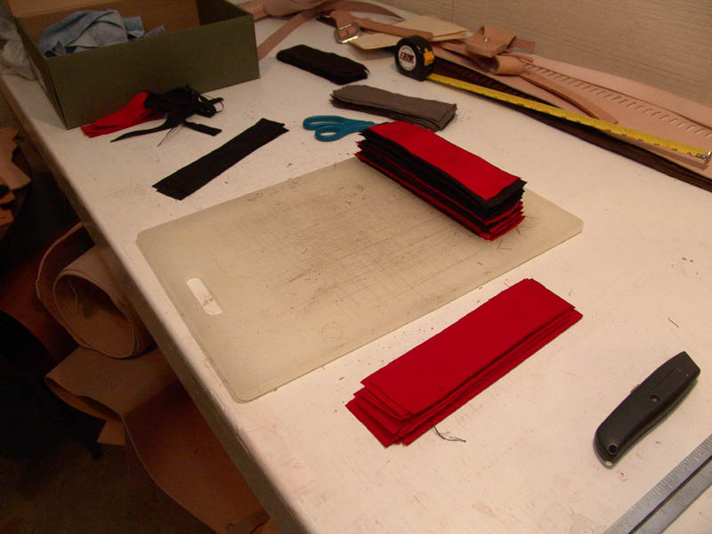 Part 3 - Making our LM105 Handle MaterialApril 10, 2010 Today we made our 3rd batch of handle material. As before, we used the West Systems 105 epoxy resin and 206 slow hardener. The temperature was in the 70s in the shop so it was an ideal day for working with the resins. We now have our process down pretty good and we can move pretty quickly through saturating our fabric with the epoxy, stacking it and pressing it. Today we are going to make some more of our twist for hidden tang knife handles and another slab of denim material for full tang knife handles. Mike Carter is making a twist handle using alternating layers of black and red fabric. We cut it into 2" x 9" strips and this handle will be a twisted block made up of about 75 layers of fabric.