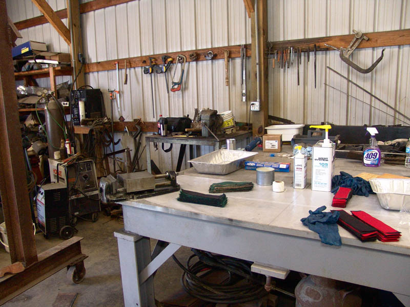 For making our twisted one-piece handles, we have been pressing them in a mill vise with a piece of plywood clamped over the top to keep the materials from squishing out the top. This has a couple of drawbacks. First, we one have one or two mill vises available at a time so that limits out production. Secondly, the mill vise jaws are only 6 inches wide so we can make one handle. We made some new presses from angle iron that are 12 inches long. They have a steel bar that can be press down from the top with c-clamps and the sides are removable in case we have trouble getting the material out after it hardens. Being 12 inches long, we should be able to make longer pieces and then cut them to get two or three handles out of each pieces. We will give the new presses a try with our next batch.