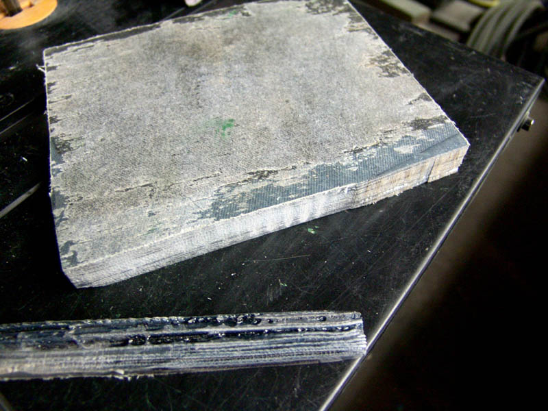 Here is Mike's denim slab. We trimmed off the ragged edges and have a nice solid slab about 3/4" thick. Here is some of cammo twist on a finished Blackhawk knife.