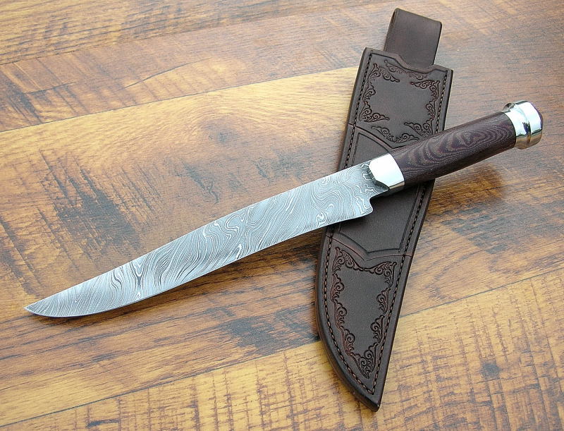 Now realizing the the heat was messing us up too much, we moved our operation into the air conditioned part of the shop. What a difference that made! We had plenty of time to work with the material before it began to heat up and harden. 20 degrees makes a huge difference with this stuff. I made another maroon and tan 70 layer twist piece and Mike Carter made a 70 layer black and gray twist. Here are the layers of black and gray fabric cut and ready to go. We should make a handle block about 1 x 2 inches like the one on top.