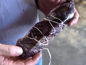 LM105 - Part 2UPDATE 8/9/09: After our intitial success with making our LM105 handle material, we made another couple of batches today and learned a few more lessons. We were again using the West Systems resin with slow hardener. It was 80-90 degrees in the outer shop. We did another twist pattern with 60-70 layers of material. By the time we had all of the pieces saturated and stacked, it had started the chemical reactions that hardens the resin. This stuff got so hot we couldn't hold it to twist it properly. There was actually smoke coming from it. We twisted as best we could wearing leather gloves covered by rubber gloves, tied it, put it in a freezer bag and then pressed it with a mill vise. It came out with a neat pattern and we like the combination of colors but we will have to see how it really turned out after it cures for a couple of days.