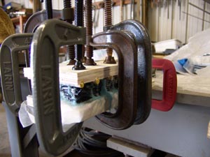 We also decided to try and make a ladder Damascus type pattern. We grooved a couple piece of plywood and glued in some small dowel rods with alternate spacing on the top and bottom pieces.